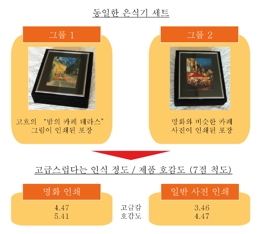 2008년, Jornal of Marketing Research에 실린, 조지아대 헤그베트 H. Hagtvedt와 패트릭 V. Patrick 교수팀의 실험도 예술전이효과를 설명해준다. 은식기 세트를 반 고흐의 "밤의 카페 테라스" 그림이 인쇄된 케이스로 포장한 경우와 이 그림과 비슷하지만 일반인들 사진으로 인쇄된 케이스로 포장한 경우로 구분하였다.
