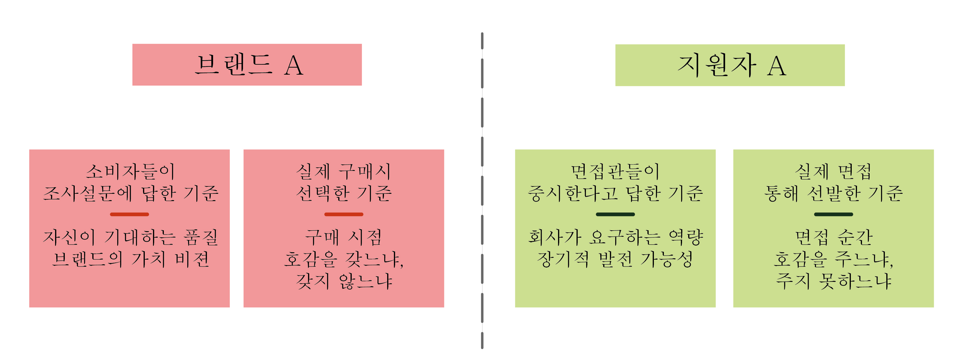 다만, 소비자가 어떤 브랜드를 선택하는 순간과 회사가 어떤 인재를 선택하는 순간은 '시간', '정보'의 정도 차이가 있을테지만, 면접의 상황과 비슷하게 브랜드를 선택하는 상황이 있다고 치자.