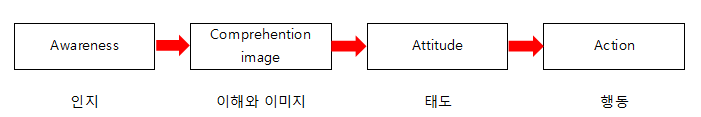 "인지 Awarebess → 이해와 이미지 comprehension & image → 태도 attitude → 행동 Action"의 단계를 거친다.