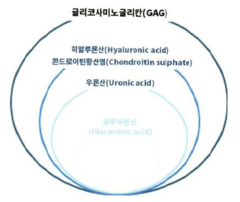 * 네이버 사전 : 글리코사미노글리칸, 강글리오사이드, 글루코론산, 우론산, 콘드로이틴황산염, 히알루론산 등