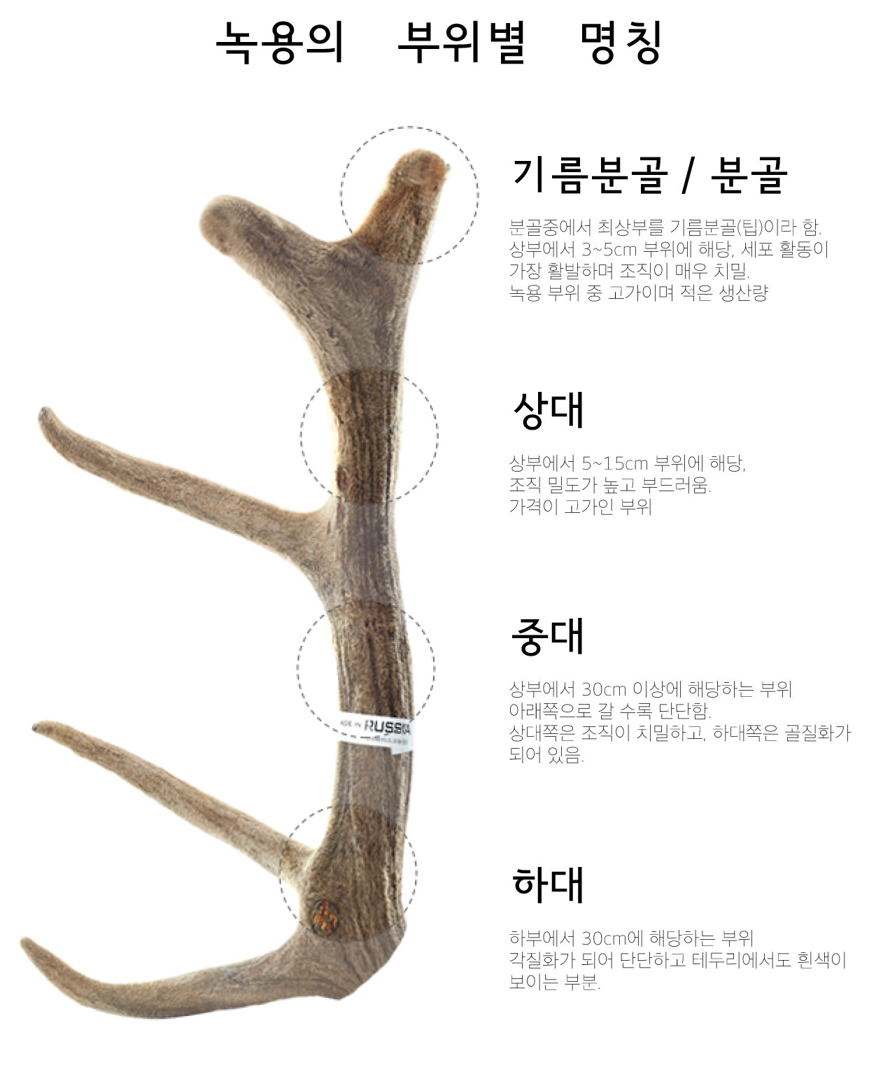 포유류에서 1년을 주기로 완전하게 재생되는 유일한 유기물이라고 한다. 사슴의 뿔은 빠른 속도로 성장하는데, 뿔의 성장기에는 연골, 골, 신경, 피부 및 혈관이 거의 동일 속도로 성장한다. 녹용은 부위에 따라 분골, 상대, 중대, 하대로 분류하고 끝 부분인 분골의 효과가 한의학적으로 가장 크다고 여겨져왔다. 실제 성분 연구에서도 아미노산, 단백, 성장인자, 당류 등의 성분이 분골에 가장 많이 함유된 것으로 나타났다.