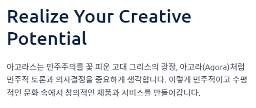홈페이지에 명시된 아고라스의 추구 가치는, 민주적 의사결정, 수평적 조직 문화, 창의적인 제품과 서비스 상품이라는 핵심 키워드를 통해 추정해볼 수 있다.