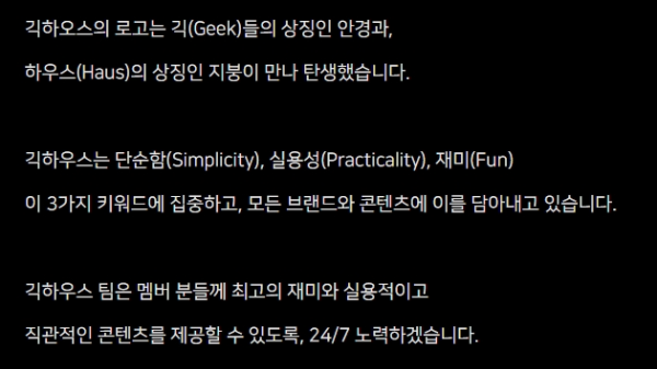 먼저, 브랜드 네임에 담긴 철학에 대해서는 긱하우스 홈페이지와 긱하우스를 개발한 회사의 사이트를 확인하여 몇 가지 요소들을 뽑을 수 있었다.