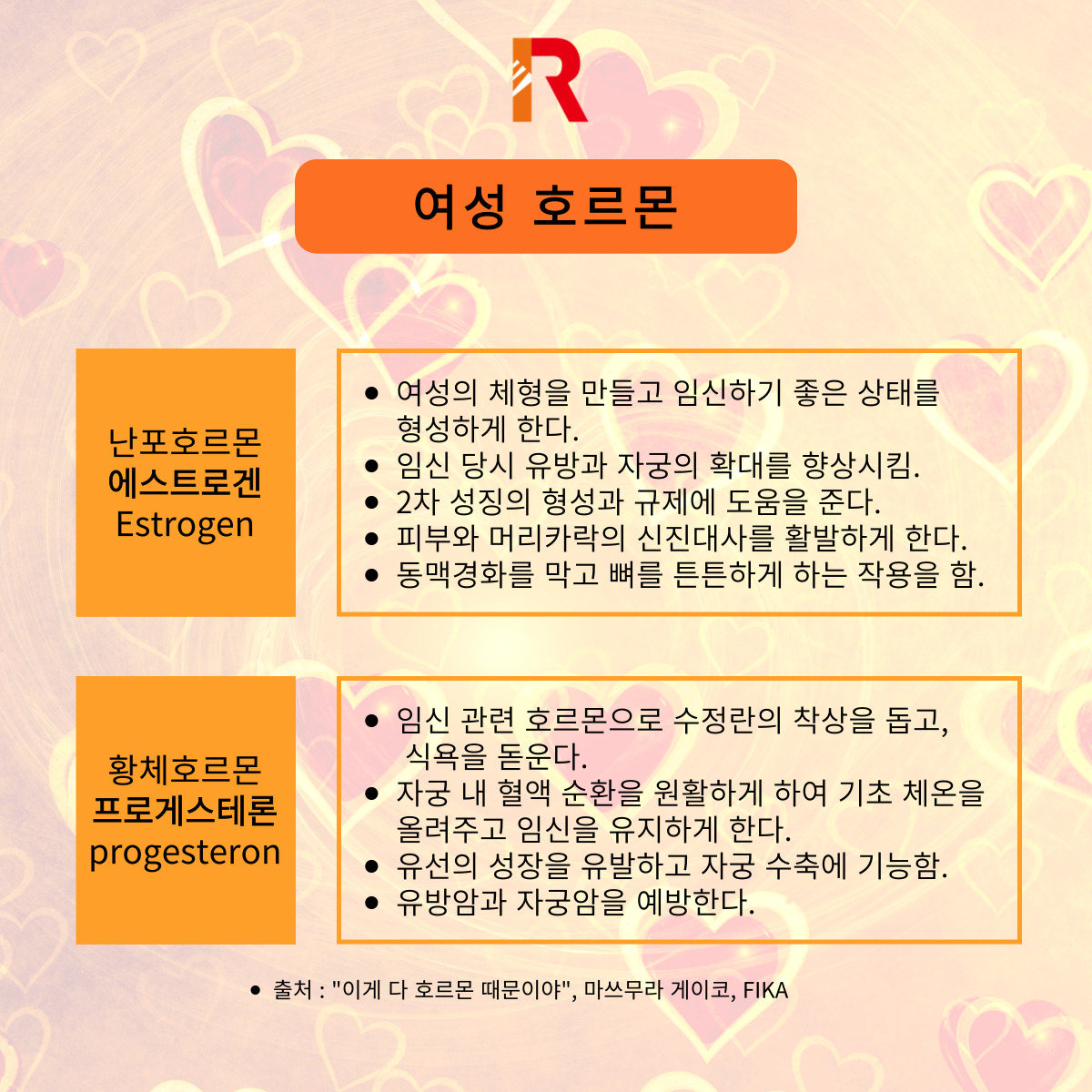 우리 몸에는 100가지 이상의 호르몬이 존재하는데, 그 중 여성 호르몬이라고 부르는 '에스트로겐 estrogen'과 '프로게스테론 progesterone', 두 가지 호르몬에 대해 간략하게 정리해보도록 하겠다.