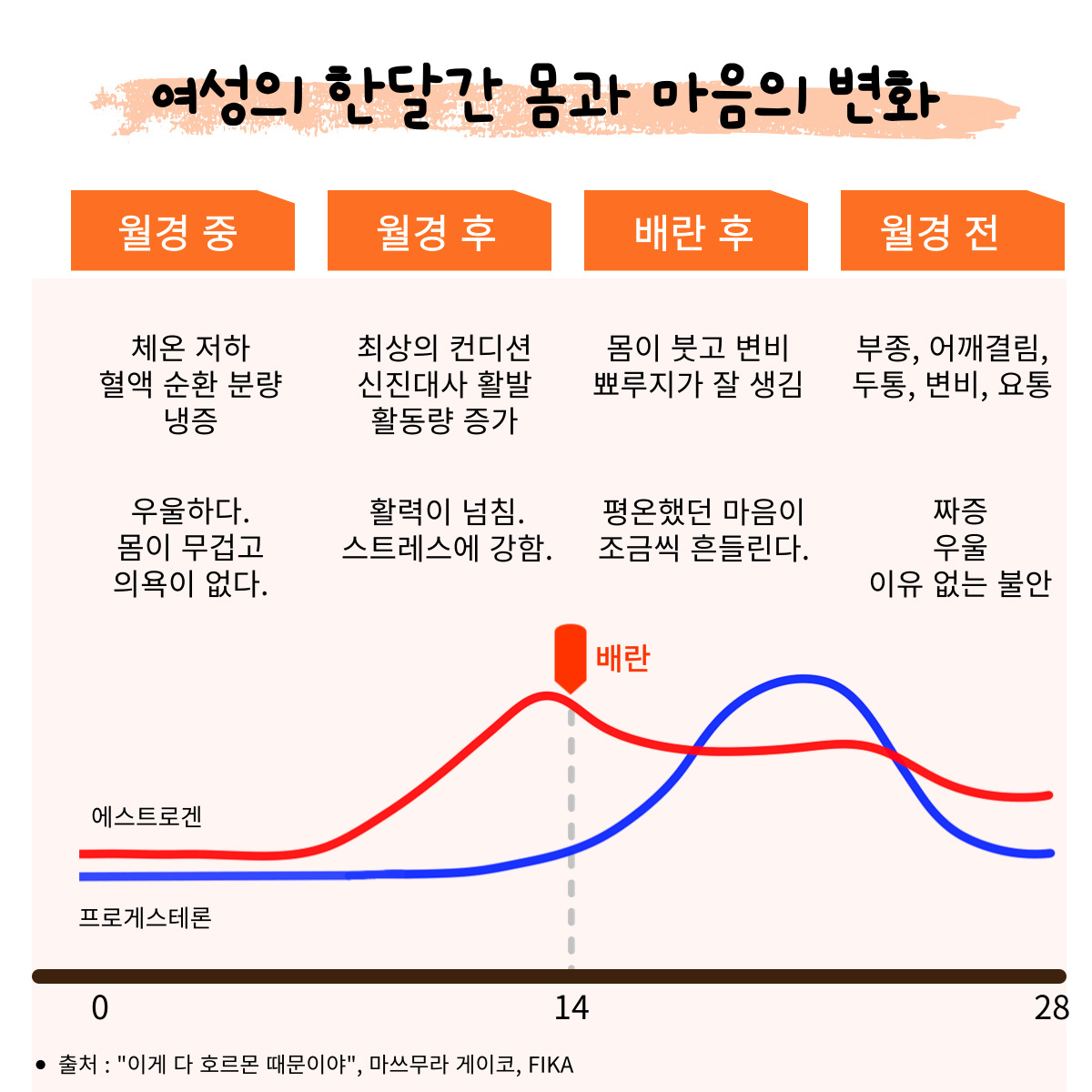 위의 그림에서와 같이 월경 주기에 따라 여성 호르몬의 분비량이 변화하고, 이에 따라 여성의 몸과 마음이 흔들리게 된다. 에스트로겐은 사춘기부터 완경기까지 약 40년간 티스푼 하나 정도의 양이 분비된다. 매달 극소량의 여성 호르몬에 의해서 여성의 몸과 마음은 자신도 통제할 수 없는 증상들을 겪으며 변화를 경험하게 되는 것이다.