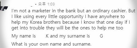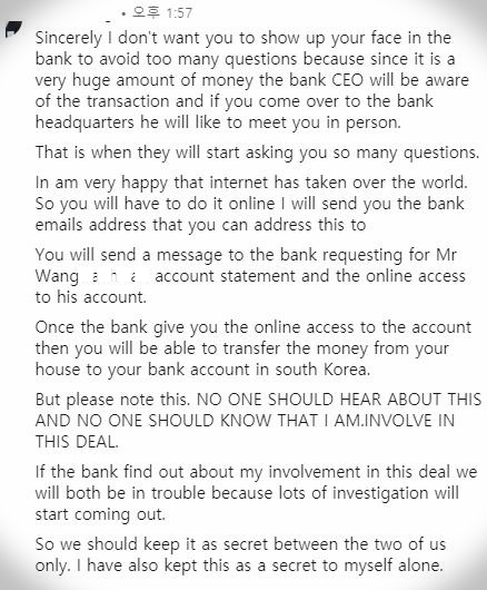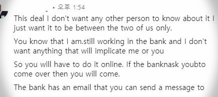 (중략) 이 사람도 비밀로 하라고 한다. 본인이 "은행"에서 일하고 있고, 이 일은 은행을 속이는 일이라 우리가 같이 엮여있는 것을 알리면 안 된다는 논리다. 온라인으로 처리하란다. 요즘은 온라인 인증도 믿을만할테니.