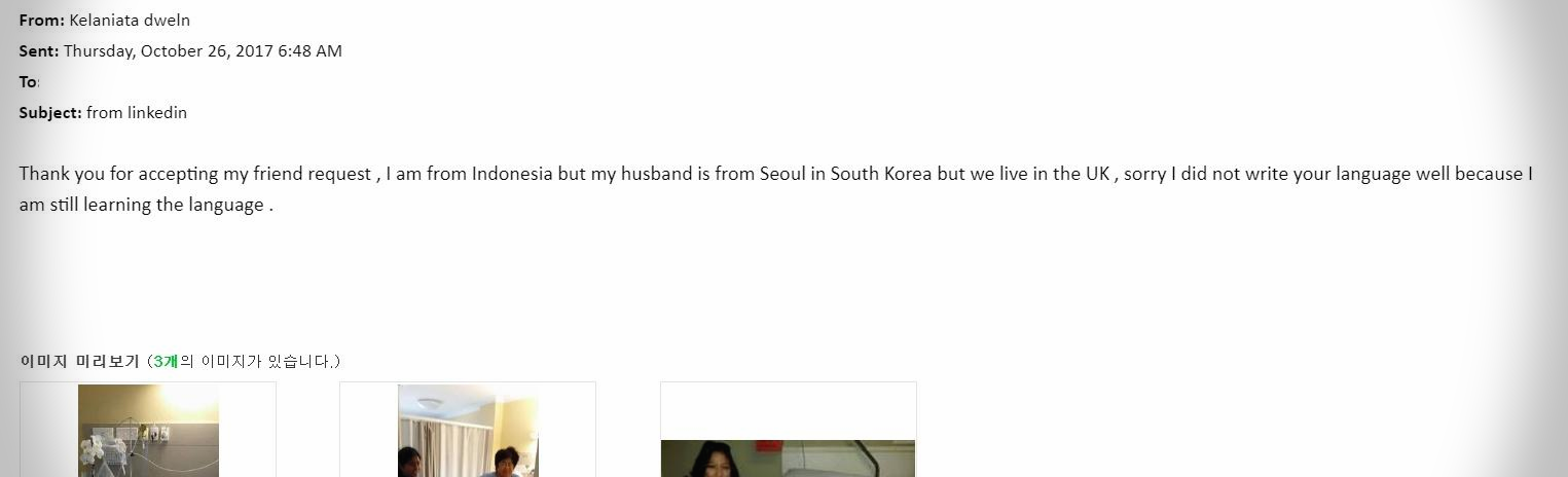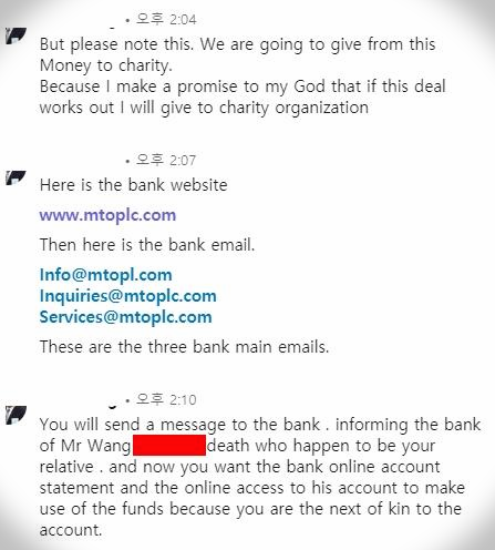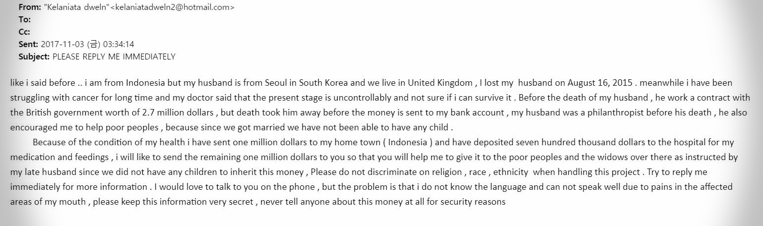 남편이 2년 전에 세상을 떠났고, 본인은 폐암으로 고통을 받고 있는 상황. 의사는 더 이상 손 쓰기 어려운 상황이라고 한다. 그런데 남편이 죽기 전에 영국 정부와 270만불 규모의 계약을 따낸 것이 있다. 그러나 아직 그 돈이 본인 계좌에 들어오지 않은 상태. 안타깝다. 남편은 자선가로 어려운 사람을 돕던 사람이었단다. 이런 글의 가이드라인을 설계자가 미리 설정하는가? 착하고 돈 많은 사람의 죽음 스토리다. 통화나 만남은 원치않고, 한국어를 모르고 병세가 악화되었기에, 오로지 온라인으로만 얘기하자고 한다. 비밀리에! 남편은 자선가인데 아내는 그 돈을 본인이 거짓된 방법으로 취하려는 사기꾼이라니!