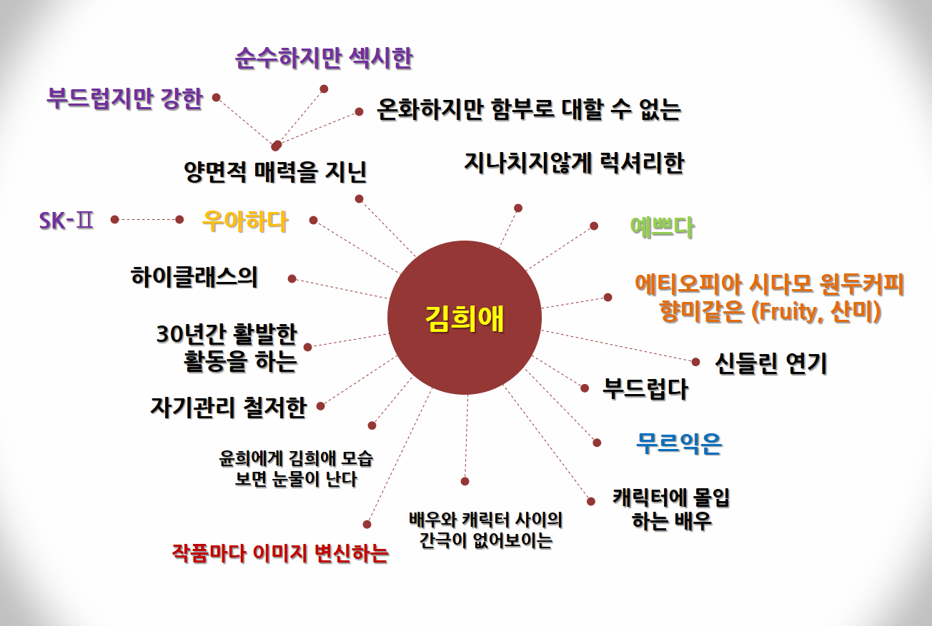 트위터, 인스타그램, 블로그, 커뮤니티 카페에 언급된 김희애 관련 단어 중에서 '이미지'를 추출할 수 있는 단어들을 정리해보았다.