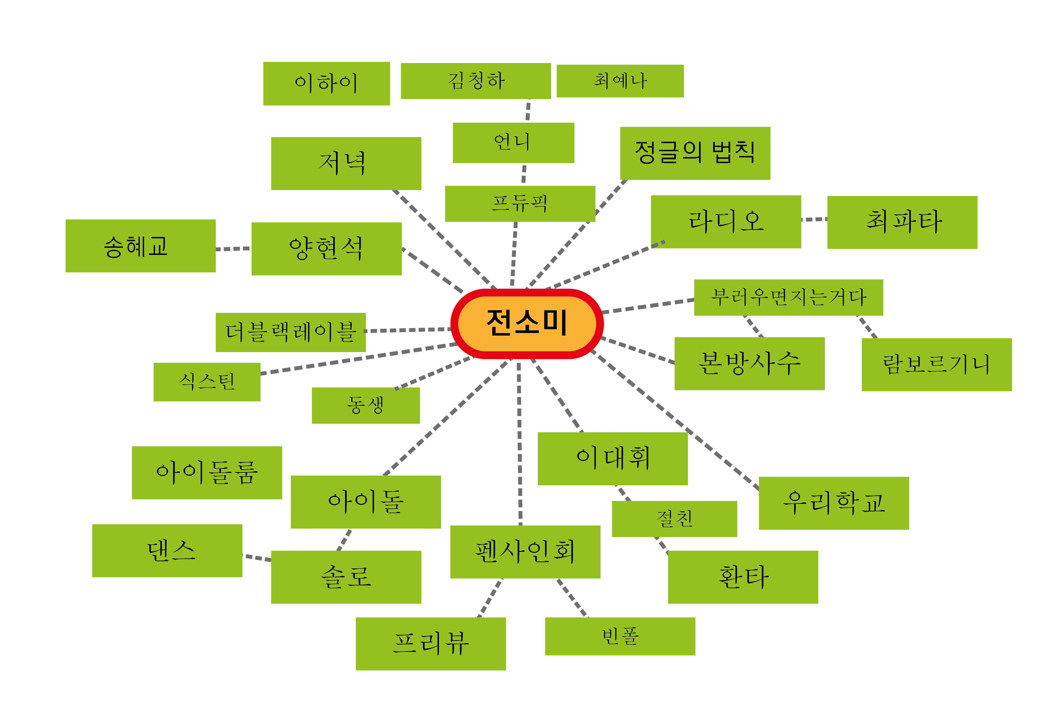 이외에 다수의 연관어들이 도출되었지만 간추려서 정리했다. 롤로이는 평소에 전소미에 대한 정보를 접하지 못했기 때문에 위의 연관어는 이 글을 보는 사람들 중 젊은 누리꾼들이 더 잘 알 수 있을 것이다. 몇 가지는 상상할 수 없는 단어들인지라 자세히 들어가서 살펴보았다.