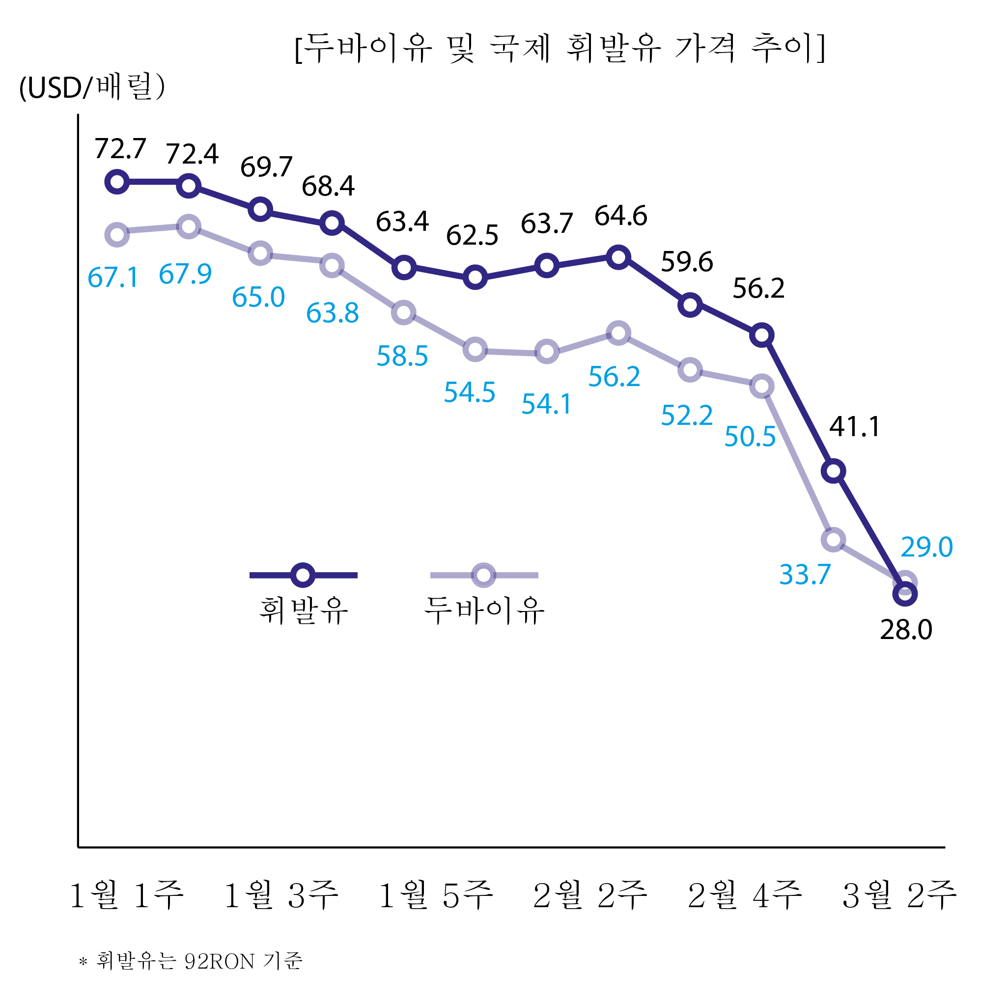 · 최근 사우디아라비아와 러시아의 '유가 전쟁'으로 국제유가가 급락하여 두바이유 가격이 배럴당 평균 29.01달러에 머물렀음에도 불구하고, 가공 제품인 휘발유 가격은 배럴당 27.98달러를 기록했다. (3월 3주차 기준)