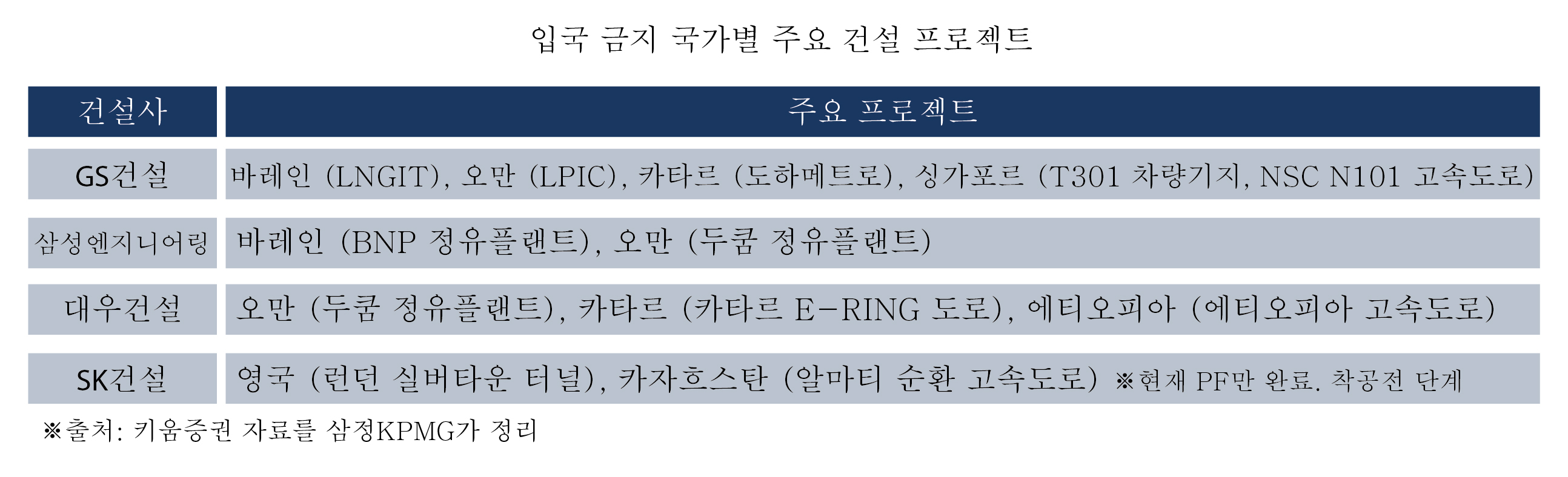· 한국인 입국 금지 조치가 장기화될 경우, 해외 현장으로 복귀해야 하는 인력들의 이동이 불가능해져, 현지 현장 관리 문제가 발생하고, 향후 해당 국가에서 진행되는 수주 활동에 제한이 있을 것으로 예상된다.