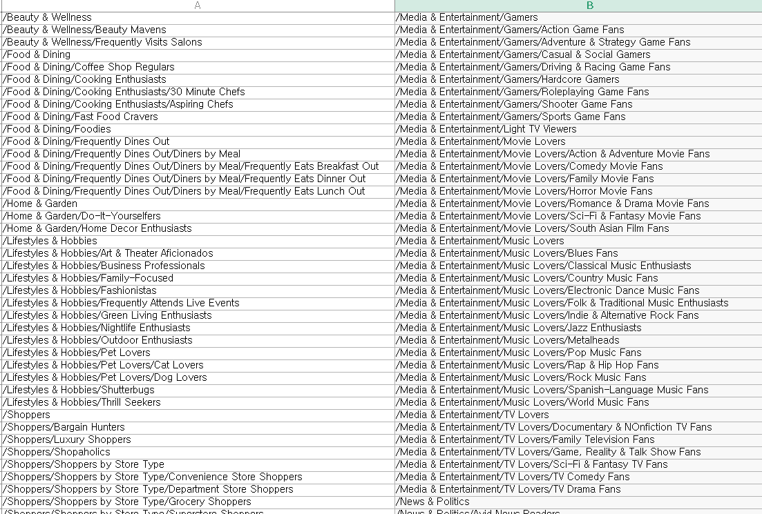 * 관심분야별 타겟팅 : 라이프스타일, 열정, 습관 등 미리 구성된 분류를 통해 캠페인 잠재고객을 선정