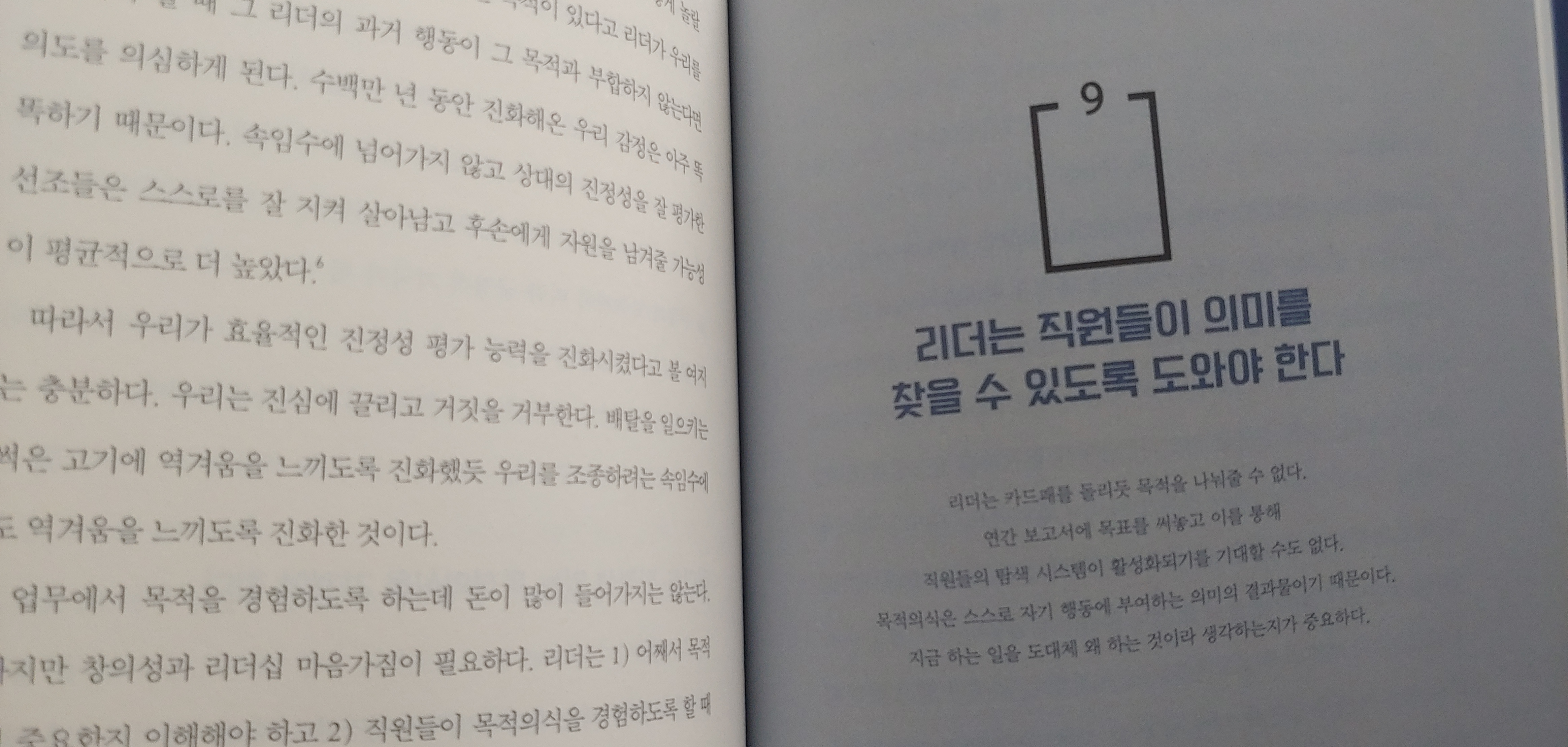 리더는, 직원들이 목적의식을 갖도록, 그 일을 '왜'하는지를 알게함으로써, 스스로에게 행동의 이유를 알고 믿을 수 있게 만들어야 한다. 프리드리히 니체가 말했던 "살 이유가 있는 사람은 그 무엇이든 견뎌낼 수 있다." (p.206) 행동의 이유를 알고 믿을 수 있다면 문제 직면시 이를 인내하고 맞설 수 있게 된다.
