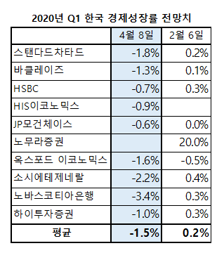 2019년 12월, 후베이성 우한에서 발생한 코로나19 사태로 Q1 기간 중국의 경제활동은 큰 제약을 받았기 때문이다. 우리나라의 Q1 경제성장률은 4월 23일 발표 예정이다. 블룸버그가 4월9일 집계하여 발표한 예측치는 전기 대비 -1.5%이다. 2019년 Q1 수치는 -0.4%로, 이때도 2008년 Q4 글로벌 경제위기 이후 41분기만에 최저치라고 언급됐다. 이번에는 그때보다 하락폭이 더 커졌다.
