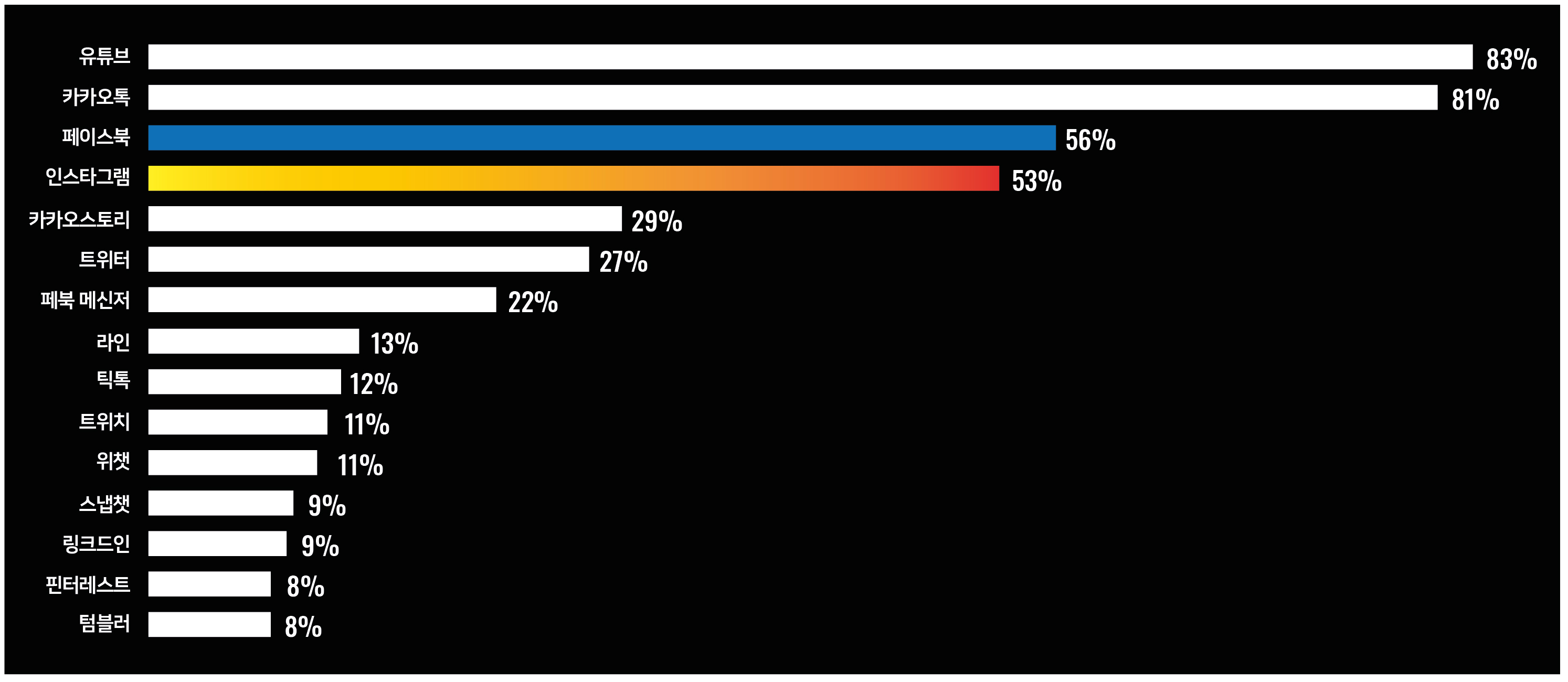 2020년 1월 현재, 우리나라 사람들 중 가장 많이 사용하는 소셜미디어 플랫폼은 유튜브로 83%가 사용하고 있다. 그 다음이 카카오톡, 3위가 페이스북, 4위가 인스타그램이다. 페이스북의 비중은 감소 추세로 파악되며, 인스타그램은 상승 추세에 있다고 보고있다. (KISDI)