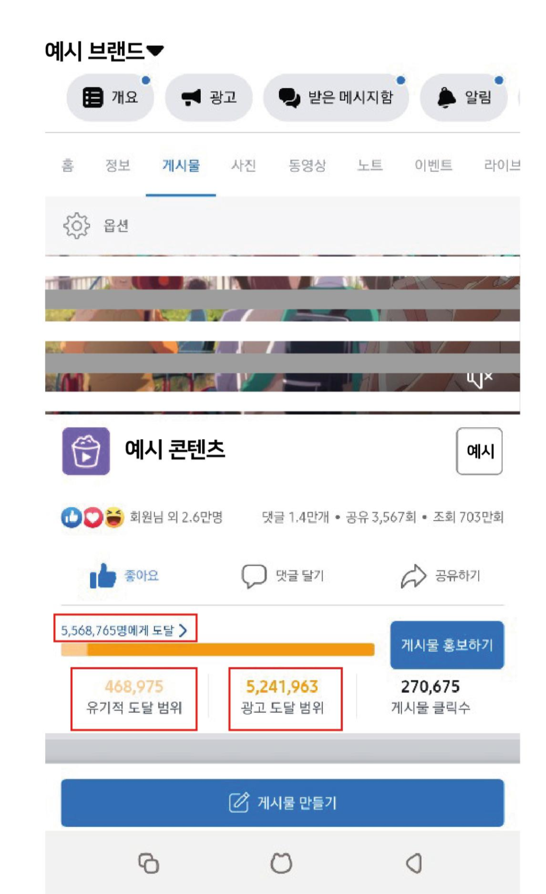 실제 557만 명에게 도달하기 위해서는 기존 마케팅 방식으로 수억 원의 돈이 들어야 가능했을 것이다. 다만, 콘텐츠가 도달의 효율성을 더 크게 만들 수 있다. 위의 예시에서는 도달의 94%가 돈을 써서 만들어졌고, 유기적 도달에 의한 것은 6%에 불과하다. 만약 A라는 사람이 어떤 콘텐츠를 보고, 자신의 이름을 걸고 공유할만한 가치가 있다면, 본인의 '친구'들에게 공유를 했을 것이다. 예시의 콘텐츠는 본인만 보고 공유는 많이 일어나지 않은 것으로 판단된다. 더욱 효율적인 광고비 집행을 위해서는 콘텐츠를 잘 만들어야 하고, 많은 공유로 이루어질 수 있도록 해야 한다.
