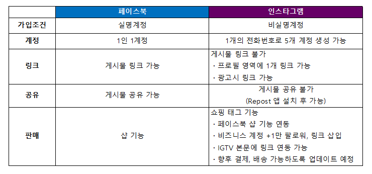 페이스북과 인스타그램을 비교해보자. 페이스북의 가입조건은 실명계정이다. 그래서 친구, 팔로워의 계정에 대해 신뢰도가 높은 편이다. 또한 계정도 1인 1계정이 필수이다. 게시물에는 '링크'가 가능하고, 게시물 공유도 가능하다. Shop 기능이 있어서 판매도 가능한 플랫폼이다.