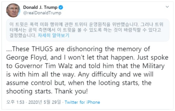 지난 5월 29일, 도널드 트럼프 미국 대통령이 페이스북과 트위터에 조지 플로이드 사망 사건과 관련하여 벌어지고 있는 시위에 대해, 시위자들을 폭도(thugs)라고 지칭하며, 위와 같은 글을 페이스북과 트위터에 올렸다.