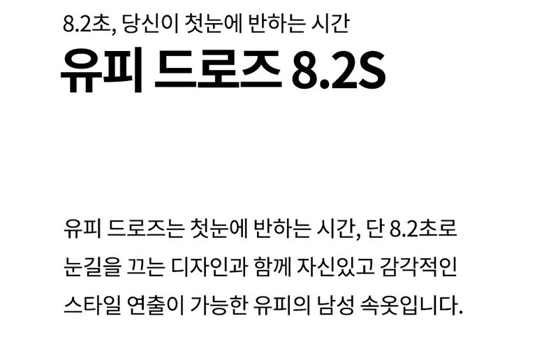 문체에서 느껴지는 심리 상태가 어떠한 것으로 보이는가? 이것이 유피라운지의 8.2초만에 매료된다는 유피 드로즈를 착용하고 쓴 글의 상태다. 유피 드로어즈가 표방하는 톤앤매너와 다른 느낌이지만, 떠오르는 키워드는 편안함이다.