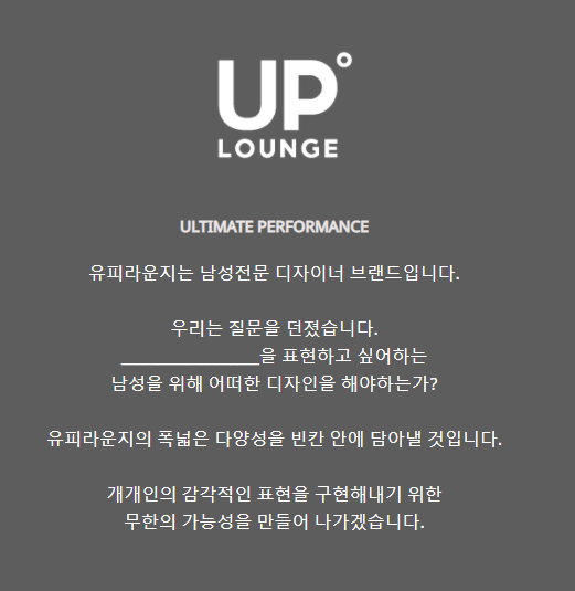 아, 남성 전문 디자이너 브랜드를 표방하는구나! Ultimate Performance의 준말로 브랜드를 만들었다. 브랜드가 추구하는 바는 명확하게 표현되지 않은 상태로 보인다. 향후 브랜드 확장성을 고려했는지, 아니면 아직 명확하게 정의하지 못했는지, 빈칸으로 남겨놓았다. 브랜드를 폭넓은 다양성 속에 넣을 것이라고. 빈칸으로 남겨놓은 공간을 앞으로 채워나갈 것이라고 한다. 롤로이는 요즘 유명 브랜드 제품을 대량으로 판매하는 것들 보다는, 이렇게 브랜드에 혼을 담아서 뭔가 해보겠다고 도전하는 브랜드들이 더 마음에 든다. 무한까지는 아니더라도 빈칸을 크게 만들고, 꽉 채워나가길 기대해본다.