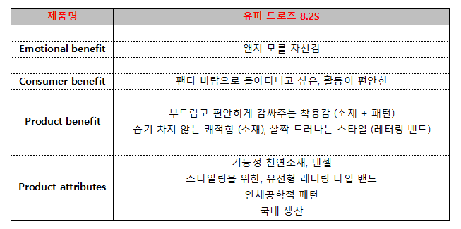 Product benefit : 이러한 제품 속성을 통해 유피 드로즈가 제공할 수 있는 효익은 편안한 착용감과 쾌적한 느낌, 멋진 스타일이라고 볼 수 있지 않을까?