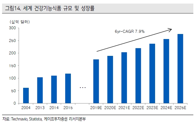 - 글로벌 건기식 시장 : 2010년부터 '17년까지 7년간의 연평균 성장률(CAGR) 6% --> '19~'25 6년간 CAGR 8% 전망
