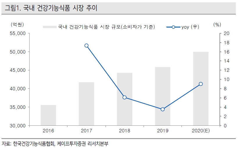 - 국내 건기식 시장은 2020년 약 5조원으로 전년대비 9% 성장 전망