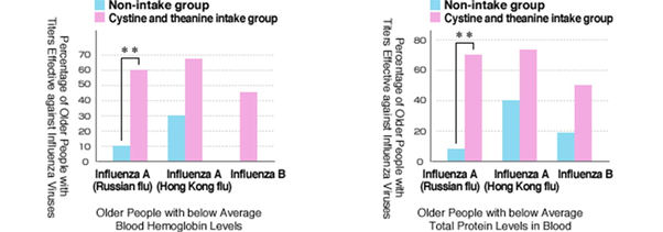 나이가 들어감에 따라 면역 체계도 약해지고 감기나 여러 질병에 걸릴 가능성이 더 높아진다. 고령자는 신체의 면역 반응이 낮기 때문에 독감 예방 접종을 하더라도 충분히 보호 받지 못하는 경우도 생긴다. 독감 예방 주사를 맞은 요양원 입소 노인 그룹의 면역 반응에 대한 시스틴(Cystine)과 테아닌(Theanine, 녹차에서 발견되는 아미노산으로 L-Glutamic acid의 γ-ethylamide)의 영향을 조사한 연구를 살펴보자.
