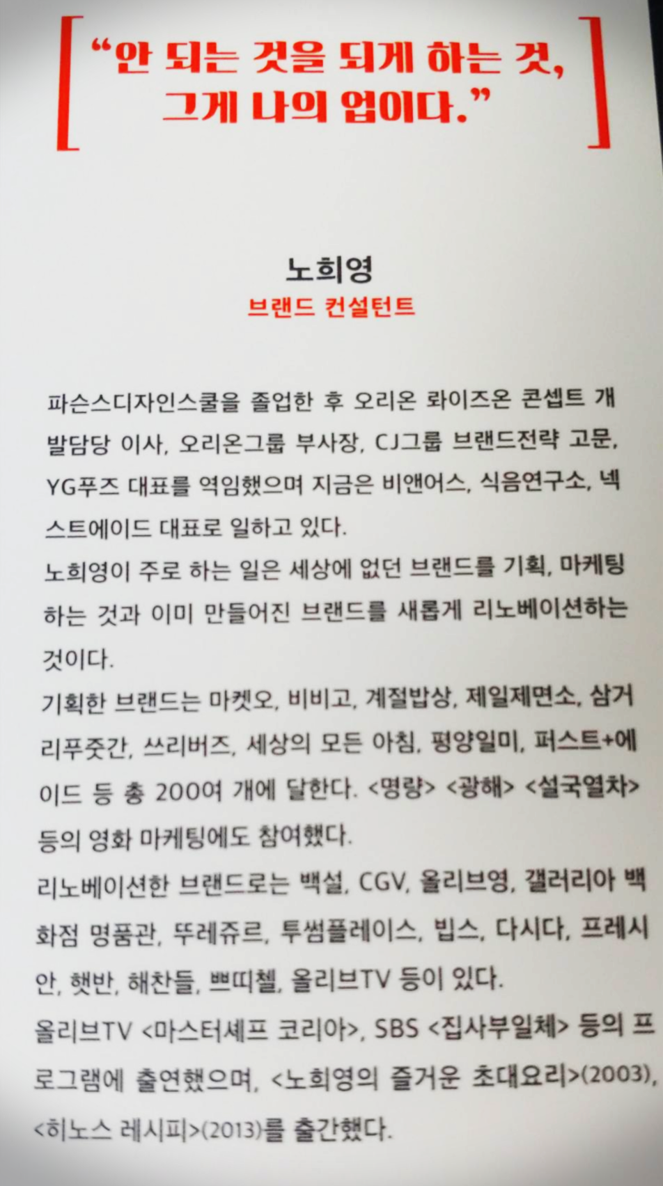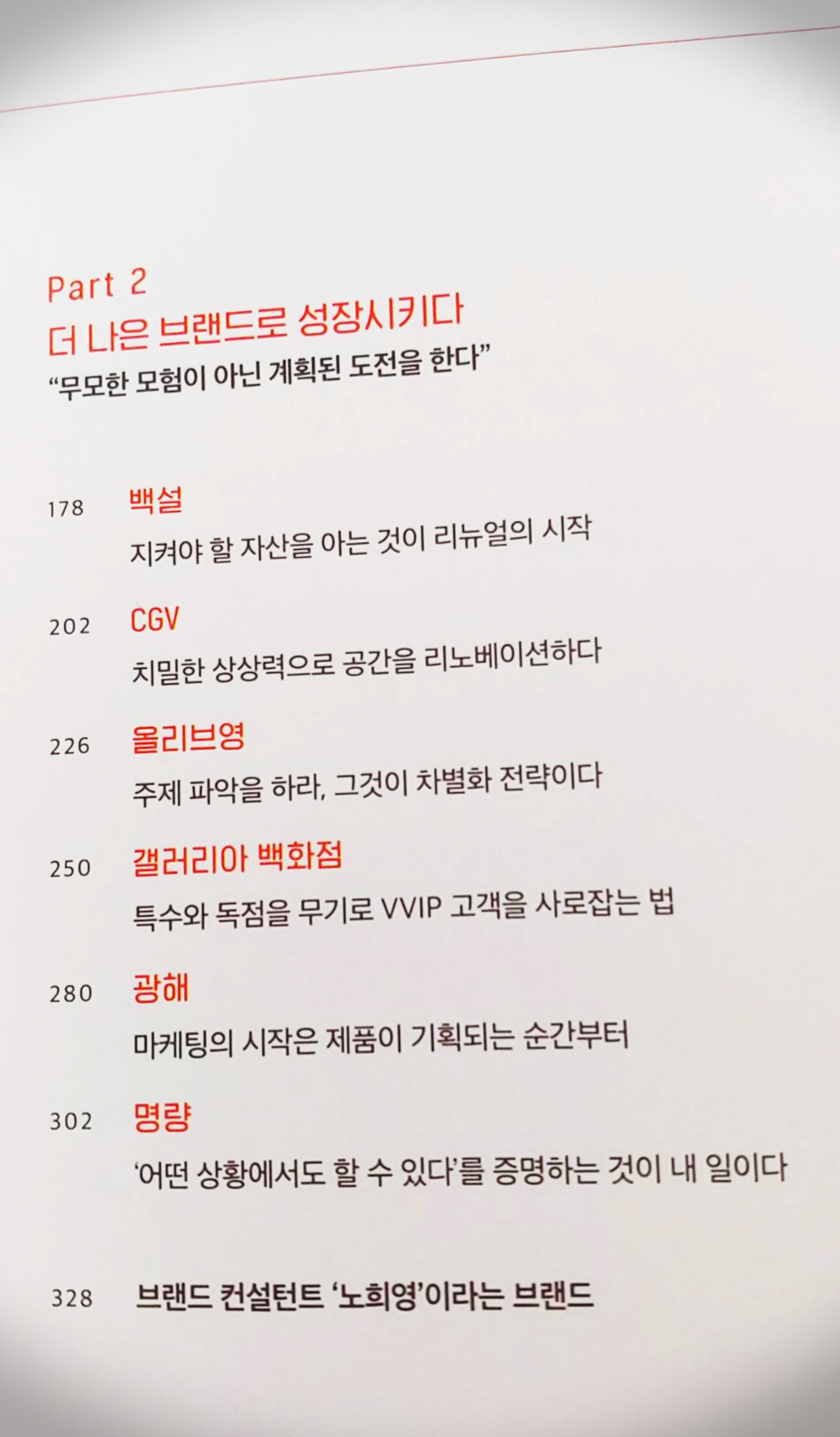 어떻게 보면, 이 책은 '노희영'이라는 브랜드를 위한 브랜딩 요소라고 볼 수 있다. 각 챕터에 담긴 저자의 브랜딩 철학이 핵심이지, 소개되는 여러 브랜드별 브랜딩 전략이 자세히 다뤄지진 않았기 때문이다.
