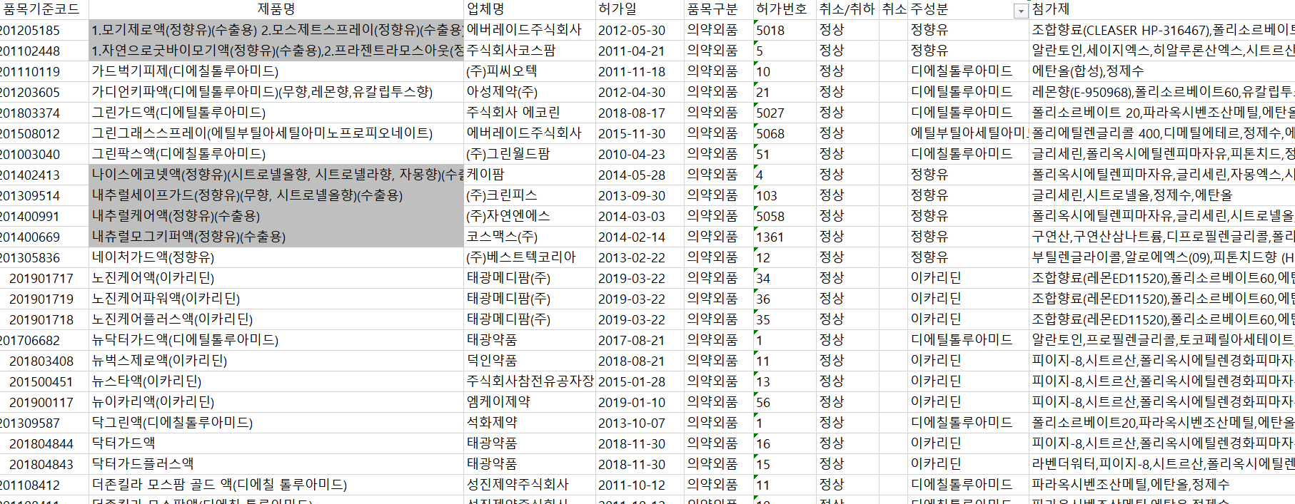 2020년 말에 조회한 결과는 식약처에서 2017년 6월에 발표한 모기, 진드기 기피제에 사용되는 7개 성분에 대한 유효성, 안전성 재평가가 이루어지면서 정리된 것이다. 강화된 유효성 기준에 미흡하거나 안전성을 입증할 만한 자료가 부족한 제품에 대해서는 신규 품목 허가를 제한하게 되었다. 이에 따라 위의 성분들 중 '수출용'으로 설정된 것들은 국내 판매를 위한 식약처 허가가 제한되는 것으로, 정향유, 시트로넬라 오일과 리나룰, 푸르설티아민염산염 등이 이에 해당한다고 볼 수 있다.